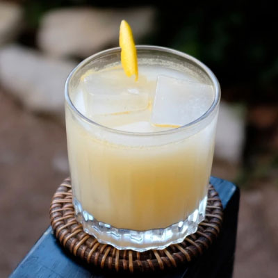 Garnish with a lemon twist and 2 skewered brandied cherries.